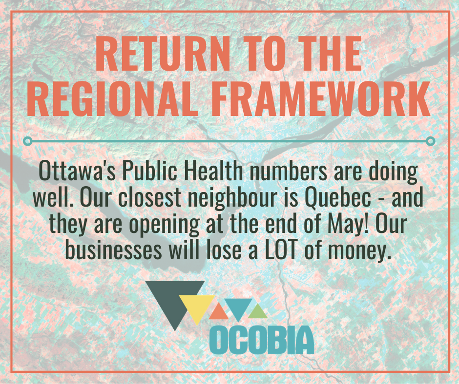 It is vital that we appreciate important regional differences. Ontario has moved away from the original Public Health Unit framework which means that benchmarks for vaccinations, cases, and hospitalizations must trend for a population of almost 15 million people provincewide. We are concerned that as national capital region shows improvement in the key indicators that would normally lead to a re-opening, this could be negatively impacted by scenarios in other regions. Further, with the province of Quebec looking to reopen for business at the end of May, we are concerned about the additional impact this will have Ottawa’s hardest hit sectors that will remain closed.